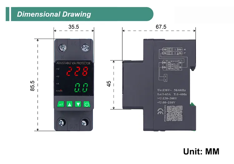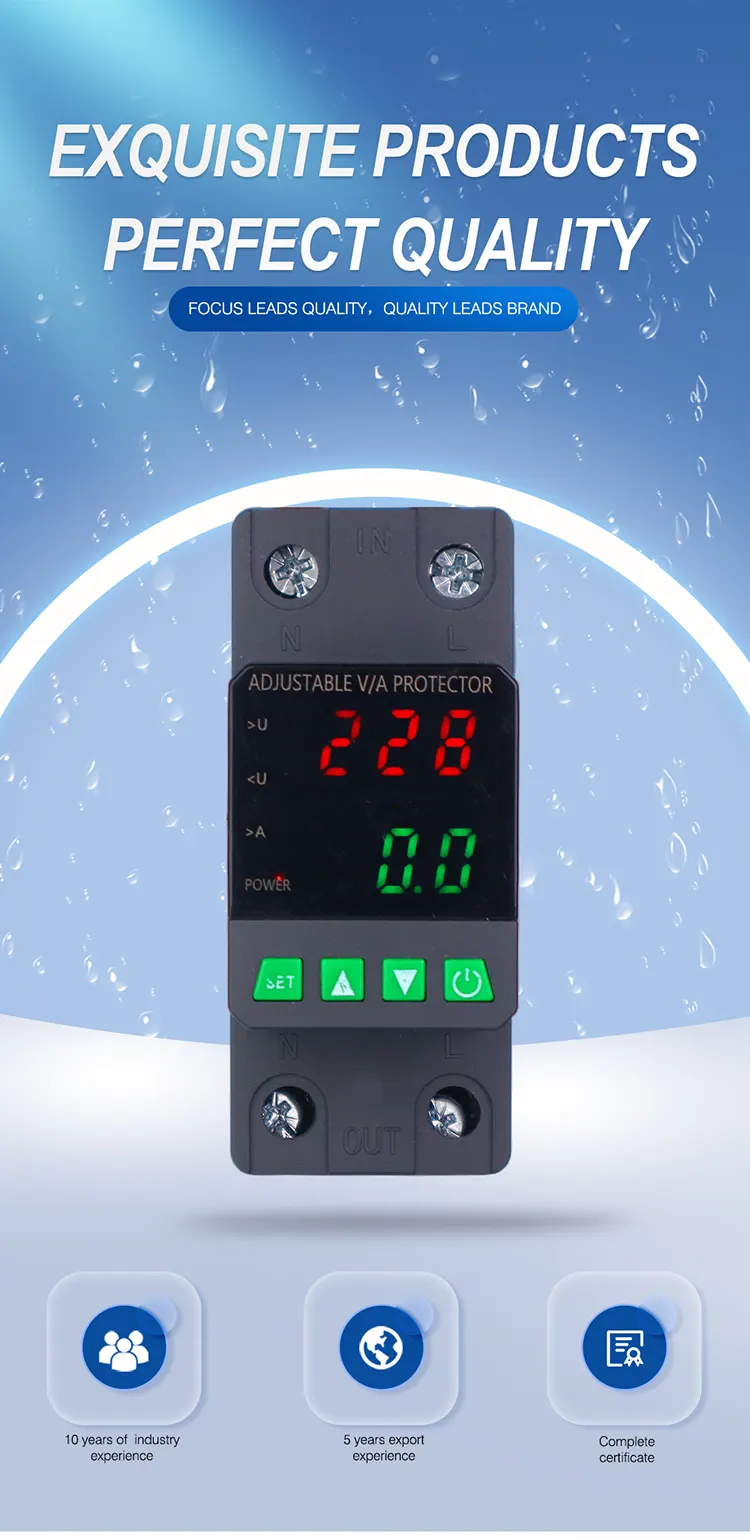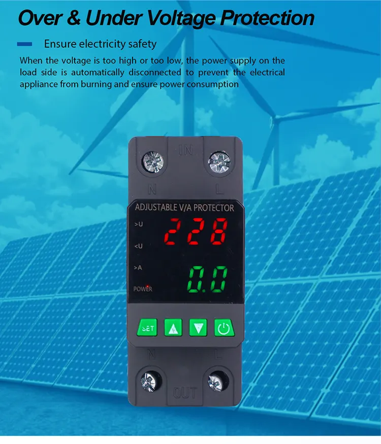 Сандық дисплеймен жабдықталған және импортталған модульдік электронды компоненттермен бірге дайындалған, оның жоғары сенімділігі мен өнімділігі жоғары. Қорғау көлігі автоматты түрде және жылдам кернеулер кезінде қуат көзін (кернеу, астын сызу немесе тор құбылуы) өшіреді және кернеу қалыпты қалпына келтірілгеннен кейін қуат көзін қалпына келтіреді.